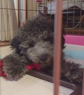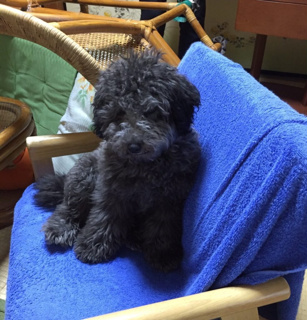 4ヶ月半の間、お店で育ったムクは、トリミングをしていないので毛がもしゃもしゃに絡まっていました。色はほぼ黒。ところどころ黒とグレーが混ざり合った不思議な色をしていました。
